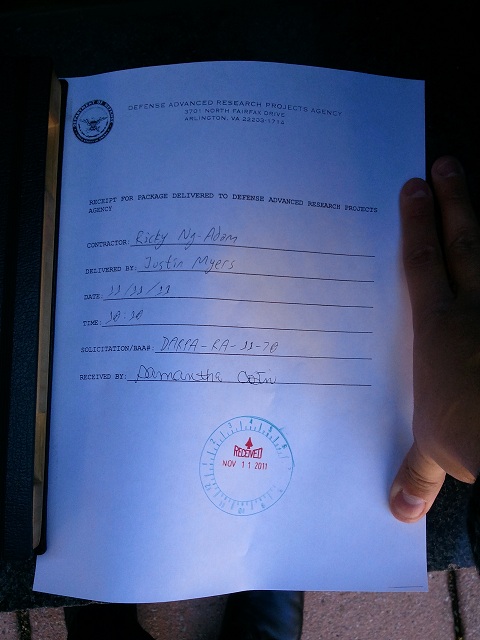 And a big, big thanks to Justin Myers from HacDC in Washington DC (http://www.hacdc.org/) who hand-delivered the document at the DARPA office in Arlington as you can see in the attachment…
