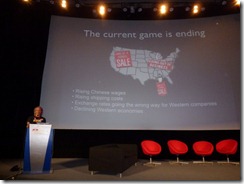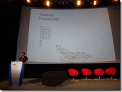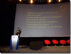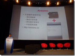 来自加州大学欧文分校的Dr Garnet Hertz也发表了演讲。他是 富布赖特项目(“Fulbright”)的研究人员,也是一位当代艺术家(http://conceptlab.com)。他原始的演讲主题是关于“Dorkbot”——“Dorkbot”是一个主题为“人类用电做奇怪的事儿”的活动,他是这个活动在洛杉矶的组织者。新车间组织过两个类似的活动而我们希望举办更多的这样的项目。但是最后他决定更改主题,展示他以往的一些项目的视频。第一个视频让好几个观众感觉反感不适,这个视频展示了一个巨型的蟑螂操作的机器人!尽管这个项目是几年前的项目,现在看起来依然非常酷。第二个视屏是关于一个非常酷的复古街机赛车游戏,其背景是由真实动态的街景路况生成。他的结论是,拥有一个想法比技术本身更重要,我们不应该从Arduino或者其他的硬件开始,我们应该从一个想法开始。他对一些创客空间计划做了尖刻的批评,尤其是从美国国防高级研究规划局(DARPA)取得资助的项目)——他认为这个制造武器无异。我认为他最后的一个批评是直接针对我而来的。。。